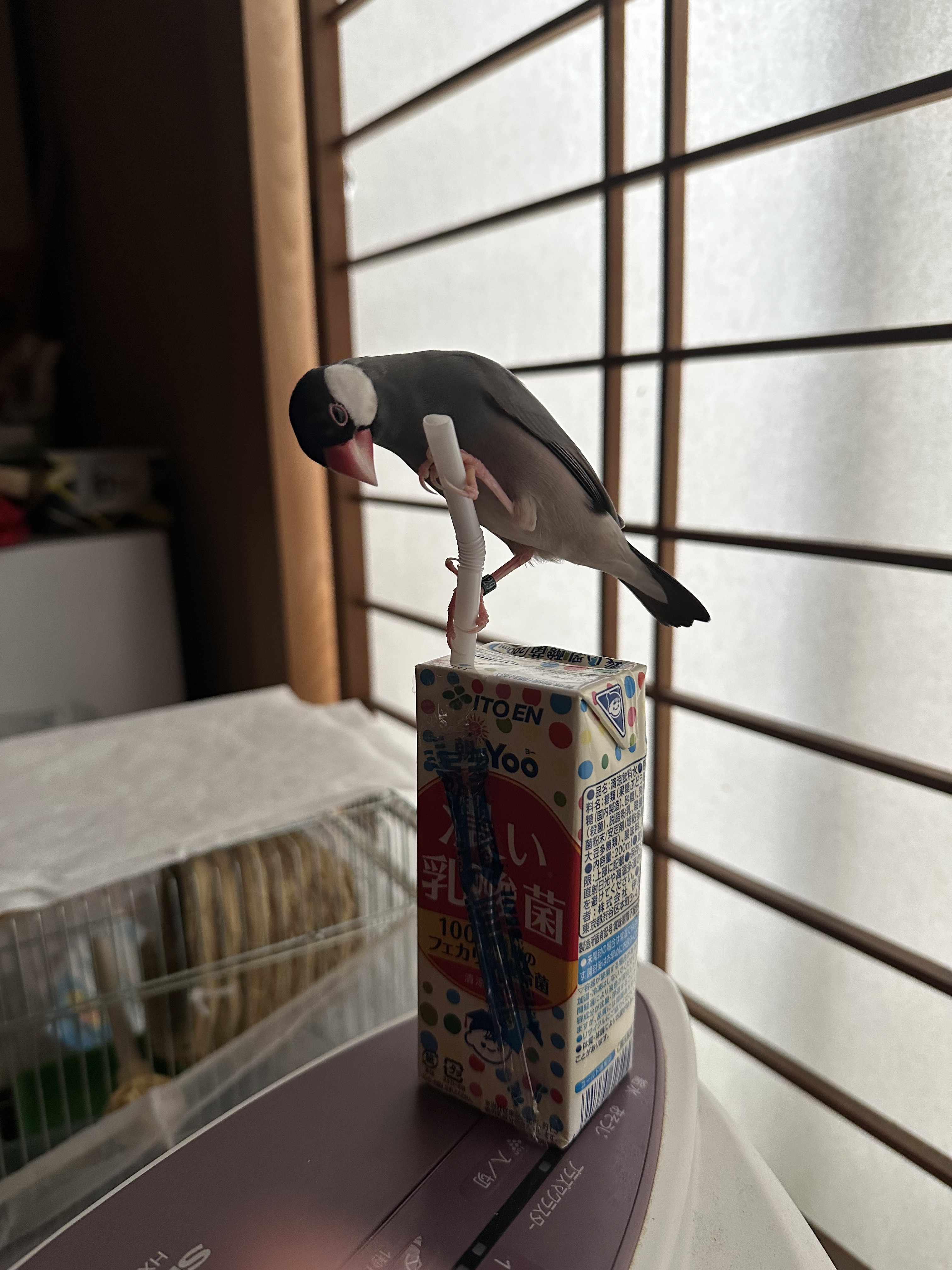 うちの文鳥チョリッピーが、“なぜかストローの上に止まっている”という