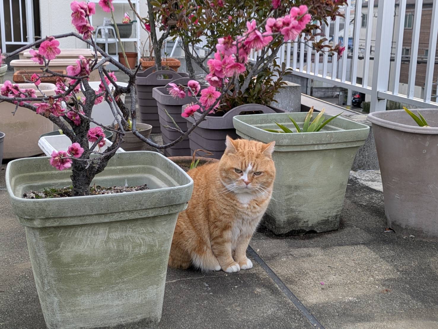 梅の花の植木鉢と写る猫さんは、なると君。風情があって、季節を感じる一枚です。京都府内にお住まいです。
